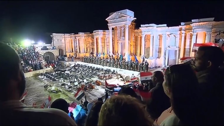Syrian musicians performed at a patriotic concert in Palmyra, Syria to celebrate the recapture of the ancient city from ISIS.May 7, 2016