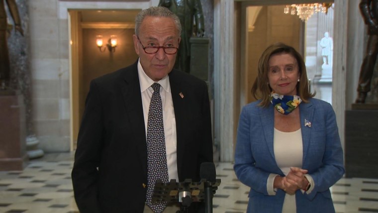 Sen. Chuck Schumer, D-N.Y., and House Speaker Nancy Pelosi, D-Calif., spoke to reporters about negotiations with the White House over the next coronavirus relief package. Sen. Schumer said there was "progress" but that no deal had been reached yet.Aug. 1, 2020