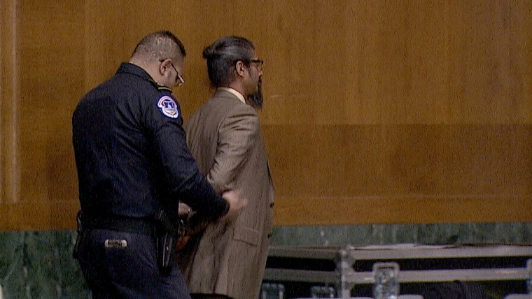 A man is led away in handcuffs Thursday at a Senate hearing on world threats, featuring the testimony of the U.S. Director of National Intelligence James Clapper.Feb. 26, 2015
