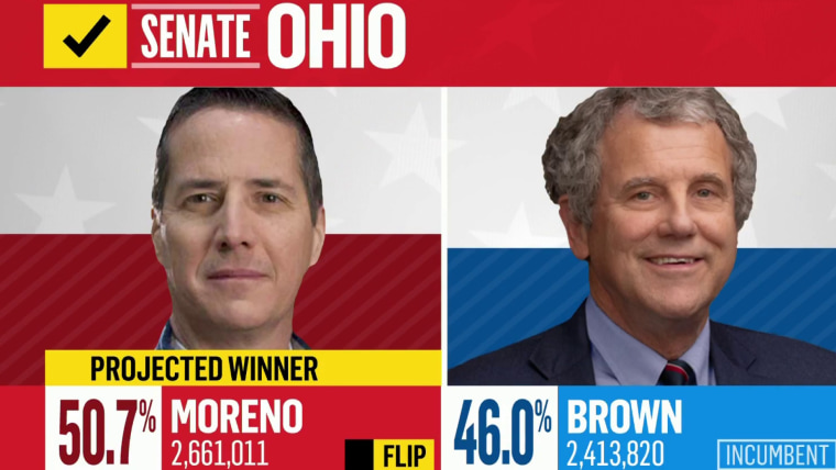 In a closely watched Ohio Senate race, Trump-backed candidate Bernie Moreno is projected to unseat Democratic incumbent Sherrod Brown. If Moreno wins, Republicans could secure control of the U.S. Senate with a projected two-seat gain, marking a major political shift.Nov. 6, 2024
