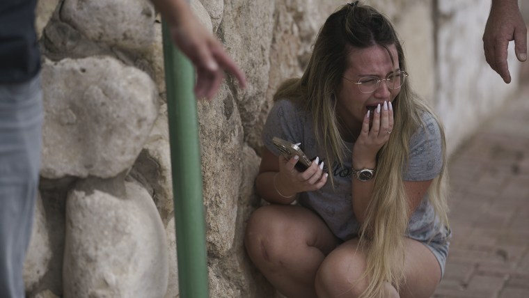 Video shows local residents crying and huddling beside a wall as rockets fired from Gaza explode around them in Ashkelon, southern Israel.Oct. 11, 2023