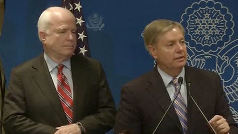 Republican Senators John McCain and Lindsey Graham talk to the media Tuesday during their trip to Egypt.Aug. 6, 2013