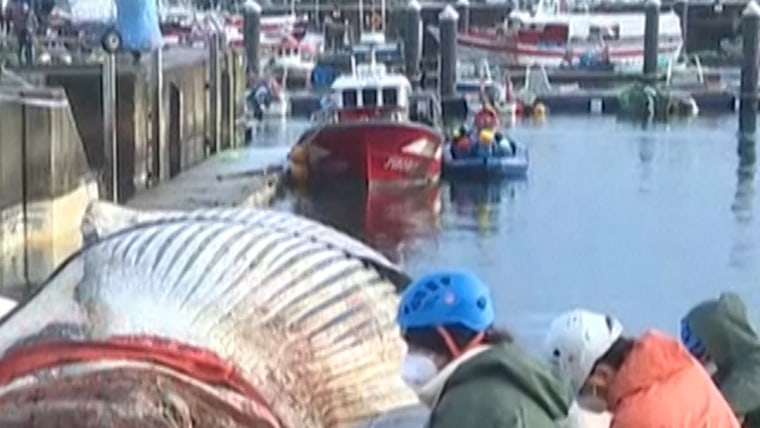 Workers remove dead whale washed up in SpainDec. 17, 2025