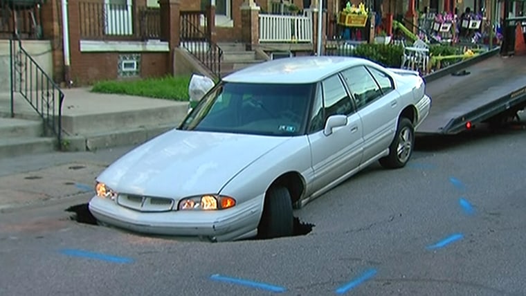 Raw video shows the front of a car partially swallowed by a sinkhole that opened up overnight on a Philadelphia street.July 30, 2013
