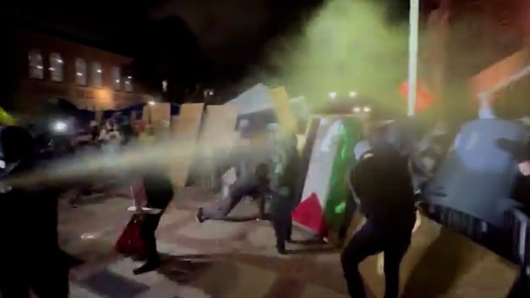 Video captured protesters supporting Palestinians and Israel clashing on UCLA’s campus, including the moment one person sprayed a substance into a crowd. LAPD riot police were also seen lined up at the scene.May 1, 2024