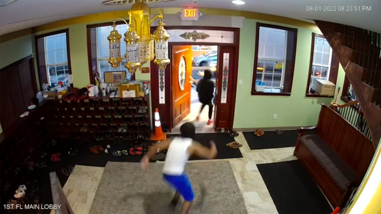 Video shows two individuals entering the Islamic Congregation of North Jersey during a prayer service and threw rocks at worshipers. NBC News obtained the video from a board member of the mosque.Aug. 6, 2022