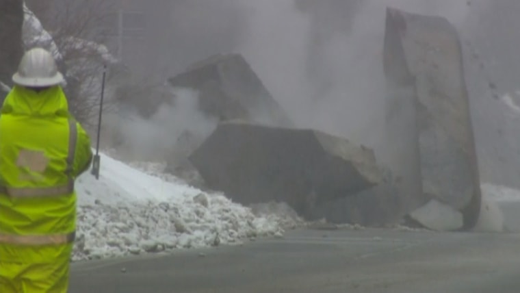 A road crew in California works to break up a giant boulder that blocked part of a highway.Jan. 14, 2016