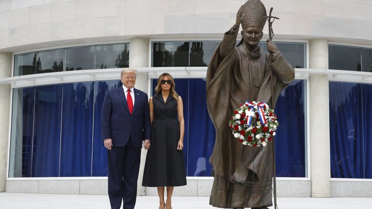 President Trump and the first lady posted in front of a wreath-adorned statue of Pope John Paul II at the National Shrine in Washington, D.C.June 2, 2020