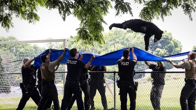 Rescue workers in Camp Hill, Pennsylvania, tranquilized a young black bear and caught it under a tree after a 20-foot drop.June 5, 2024