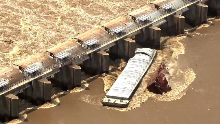 A pair of barges broke free from their moorings on the swollen Arkansas River on Thursday in Oklahoma and slammed into a dam. One barge immediately sinks while the other went down within a minute.May 23, 2019