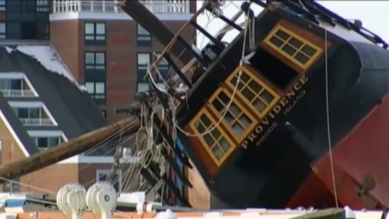 The 110-foot-tall Continental Sloop Providence sits battered and broken at Rhode Island's Newport Shipyard. WJAR’s Adam Bagni reports.Jan. 29, 2015
