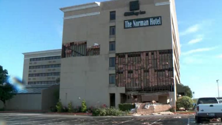 Travelers seek shelter in center hallway as winds rip away at exterior or Oklahoma's Norman Hotel. Scott Hines reports.May 7, 2015