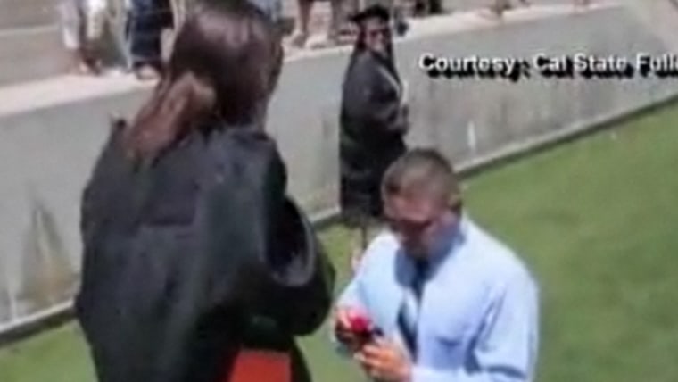 After participating in a surprise flash mob at her Cal State Fullerton graduation ceremony, Rocio Almaraz, 23, was on the receiving end of another surprise: Her boyfriend got down on one knee and proposed. KNBC-TV’s Vikki Vargas reports.May 24, 2012