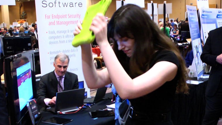M-Edge produces an iPad case made from a material similar to nerf foam. Meant to protect the case from kids, MSNBC.com's Rosa Golijan tests it out for herself — against a wall.Jan. 10, 2012