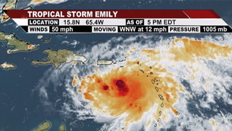 Tropical Storm Emily is pushing westward across the Caribbean, and its possible path includes Florida. The southern tip of the state could feel Emily‘s first strong winds Friday night. NBC’s Brian Williams reports.Aug. 3, 2011