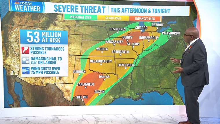 Much of Indiana, northern Kentucky and western Ohio — including in Indianapolis, Evansville, Louisville and Cincinnati — are under a tornado watch until 12 p.m. ET. Approximately 67 million people are under the threat of severe storms from northern Pennsylvania down to the Gulf Coast.