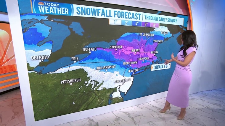 Snowfall of 6 to 9 inches has been recorded in the Dakotas, Minnesota and Wisconsin as the low pressure front moved into the Mid-Atlantic and Northeast on Saturday night, according to the National Weather Service and NBC News meteorologists.