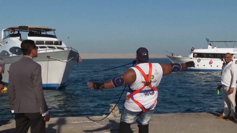 The scene was set Saturday at the shore in Hurghada. Mahrous first pulled a 700-ton ship, and to affirm his challenge he pulled two ships weighing approximately 1,150 tons together.