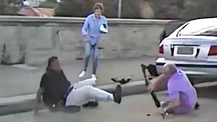 The dashcam video, which was shared on social media Tuesday and verified by NBC News, shows a man and a woman wrestling with and ultimately disarming a man on the side of the road.