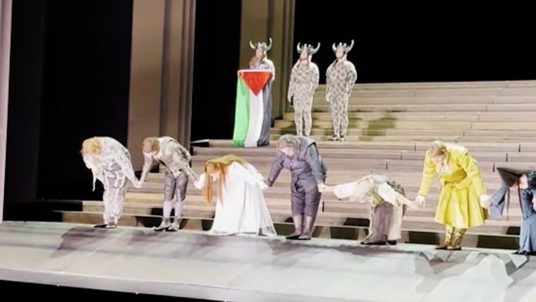 “The display of the flag was an unauthorized action by the artist,” the opera company said in a statement on Sunday. “It was not approved by the Royal Ballet and Opera and is a wholly inappropriate act.”