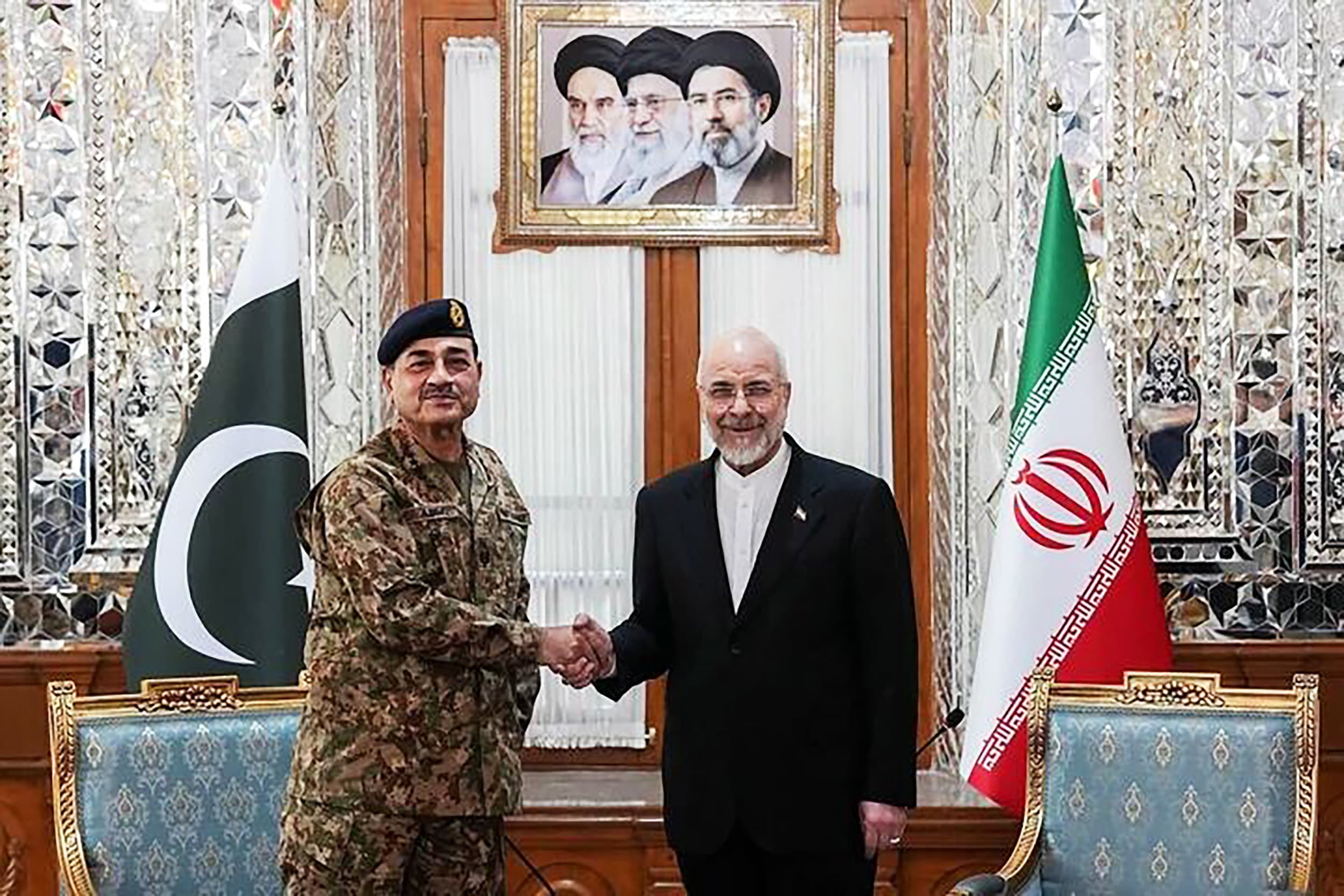 Images published by Iranian state media show Parliament Speaker Mohammad Bagher Ghalibaf meeting with Pakistan’s army chief, Asim Munir.