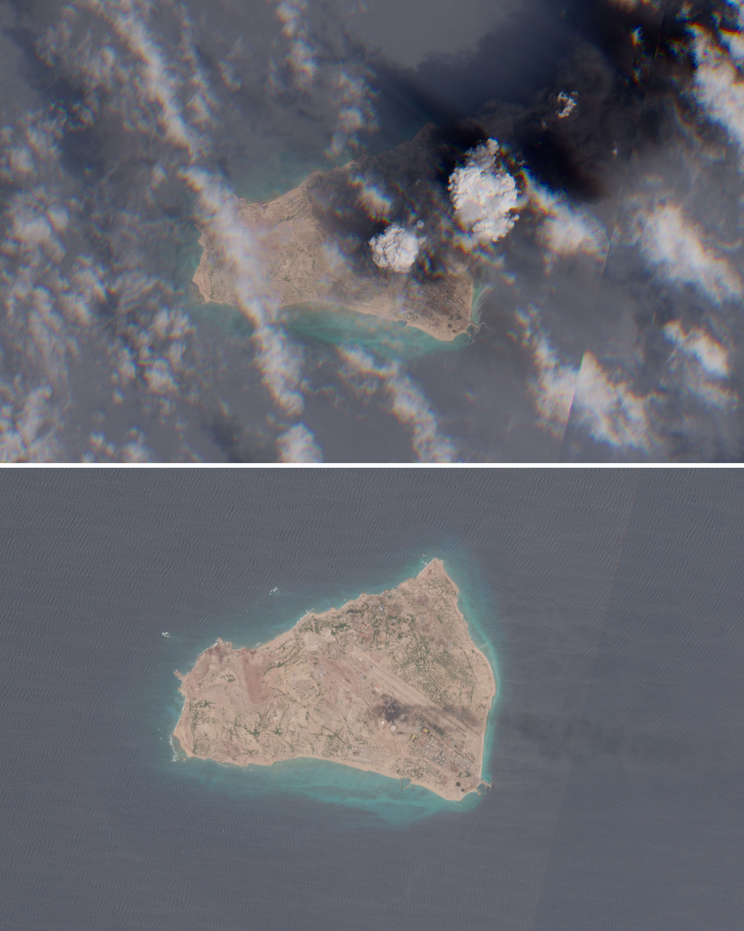 Visible smoke rising from Sirri Island on both April 10, above, and April 15, below. Copernicus Sentinel/European Union
