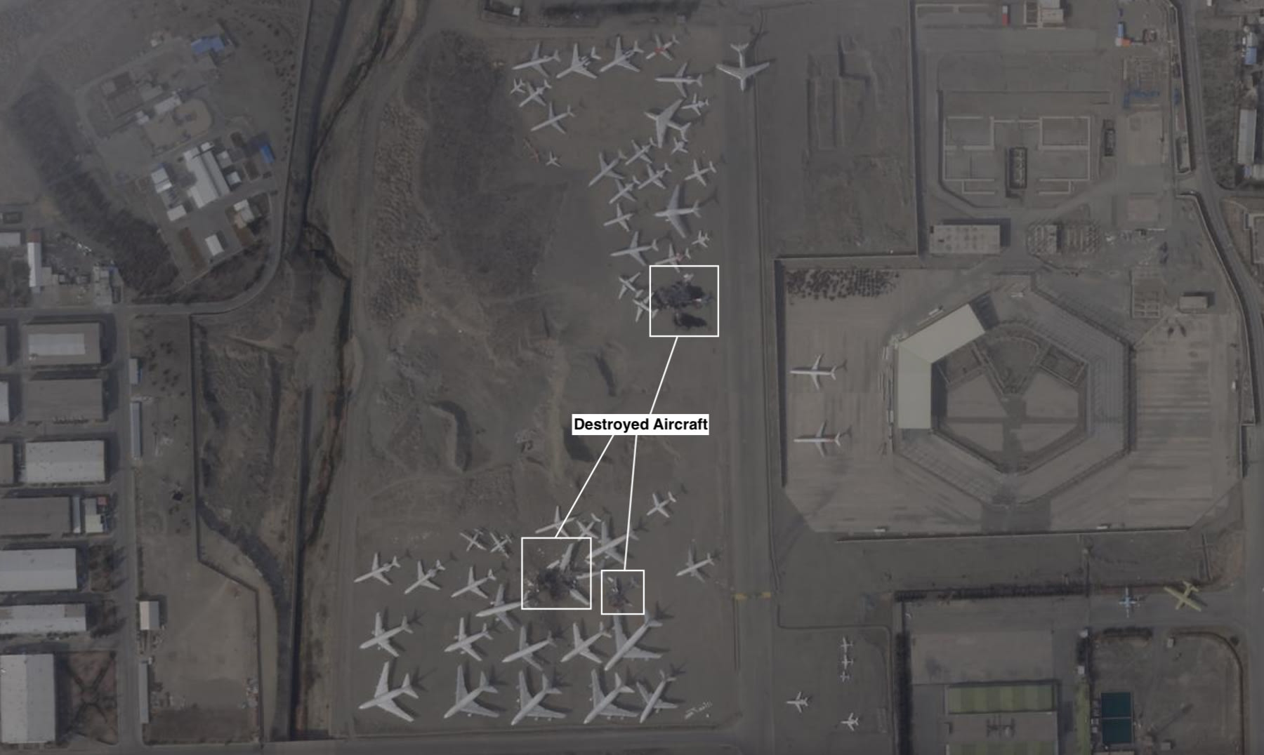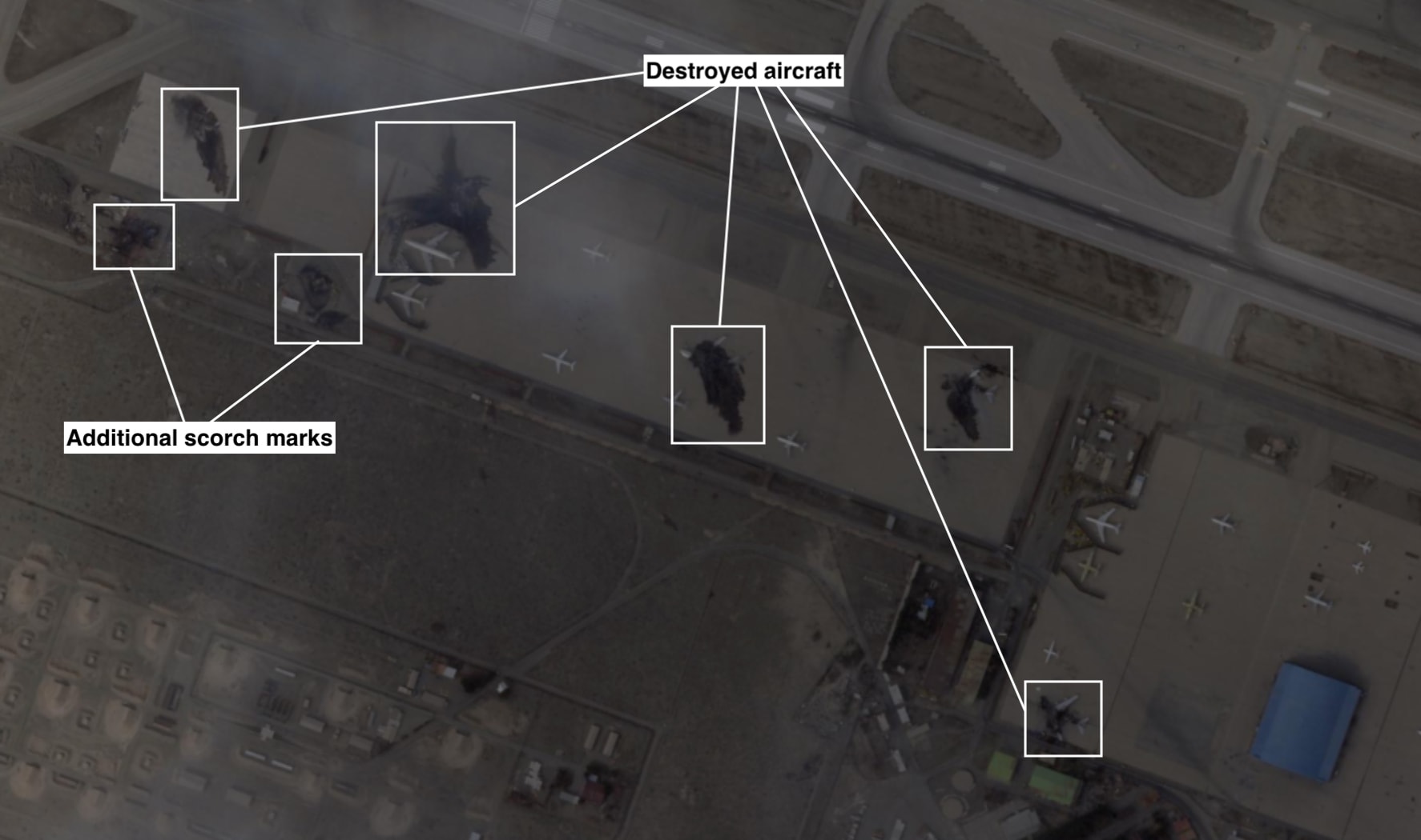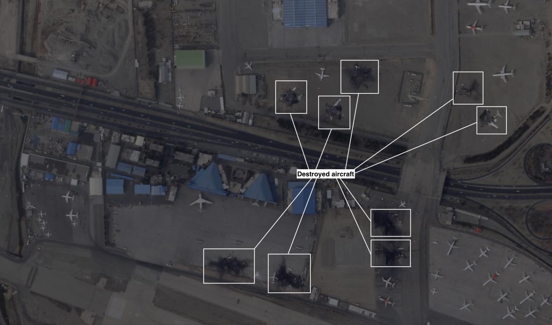 The images show more than a dozen aircraft destroyed, pieces of the planes scattered across the scorched tarmac.