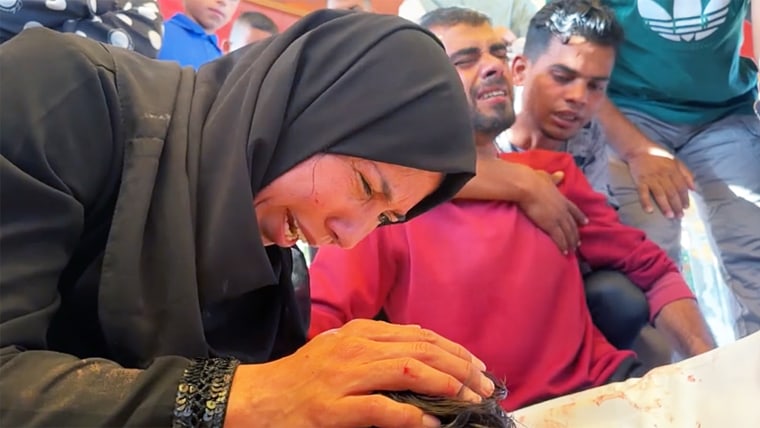 She strokes 10-year-old Ashraf Wafi's hair Tuesday, the moment captured by NBC News’ crew on the ground in Gaza. Later, before the funeral, the child's father, Mahmoud, kisses his son’s feet, the white shroud stained with bright-red blood.