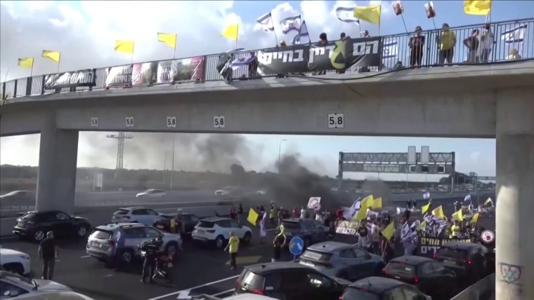 Israeli protesters blocked roads in Tel Aviv and elsewhere in the country, holding up pictures of hostages still held in Gaza and calling for the war to end. A rally planned outside Israel’s defense headquarters later on Tuesday is expected to draw thousands of people.