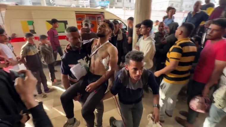 Video from an NBC News team on the ground showed a truck arriving at Nasser Hospital carrying several wounded men. Bystanders rushed the men inside, laying them beside other bloodied bodies strewn across the floor.