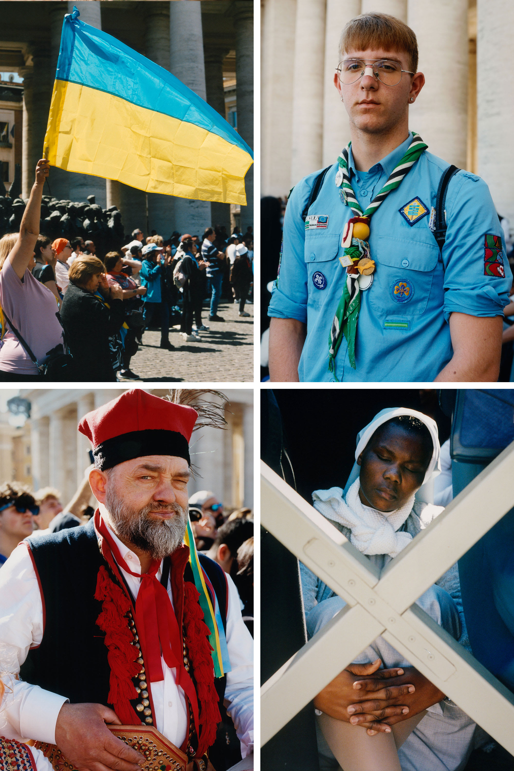 The selfie sticks and gelato tubs of the day have given way to a more reflective scene. Near the barrier at the front, a group of Mexican nuns strike up a soft rendition of Salve Regina.